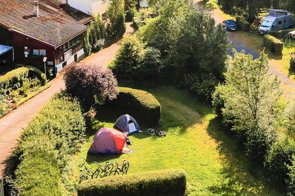 Spacious pitch (9 by 8 metres) surrounded by shrubs and flowering plants giving a private garden feeling. Paved driveway, electricity point, adjacent to the paved path, overlooking the river, close to sanitary facilities, morning/early afternoon sun.